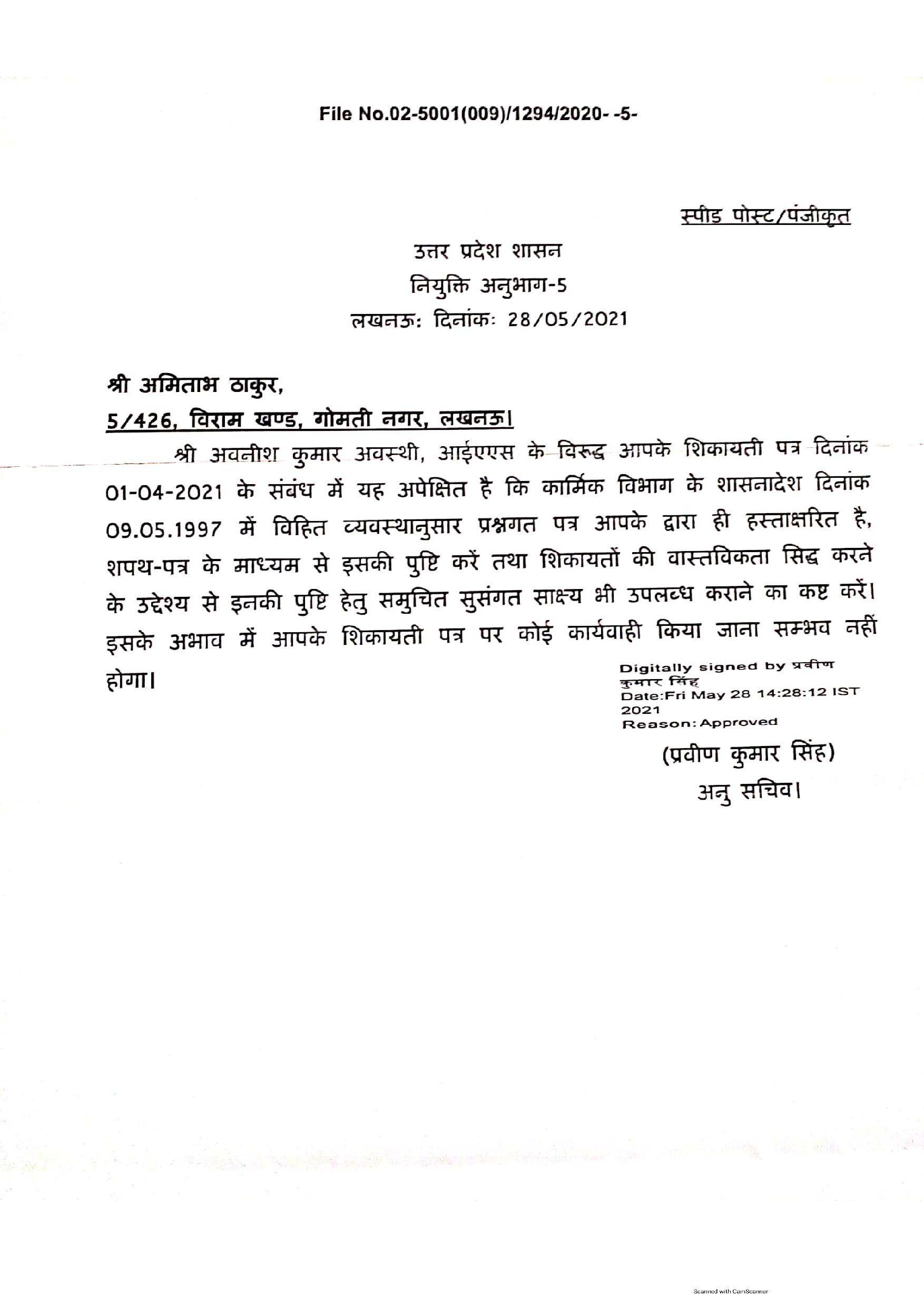 लखनऊ: विकास दुबे के खजांची के साथ अपर मुख्य सचिव गृह अवनीश अवस्थी की फोटो वायरल हुई थी. इस पर पूर्व आईपीएस अमिताभ ठाकुर ने केंद्र सरकार से शिकायत कर जांच की मांग की थी. केंद्र सरकार ने मुख्य सचिव राजेन्द्र तिवारी को जांच करने के आदेश दिए थे. अब यूपी सरकार के नियुक्ति अनुभाग-5 ने पूर्व IPS अमिताभ ठाकुर को पत्र लिखकर गैंगेस्टर जय बाजपेयी से IAS अवनीश अवस्थी के संबंधों की शिकायत के मामले में साक्ष्य मांगा है. पूर्व IPS ने ट्वीट कर इसकी जानकारी साझा की है.