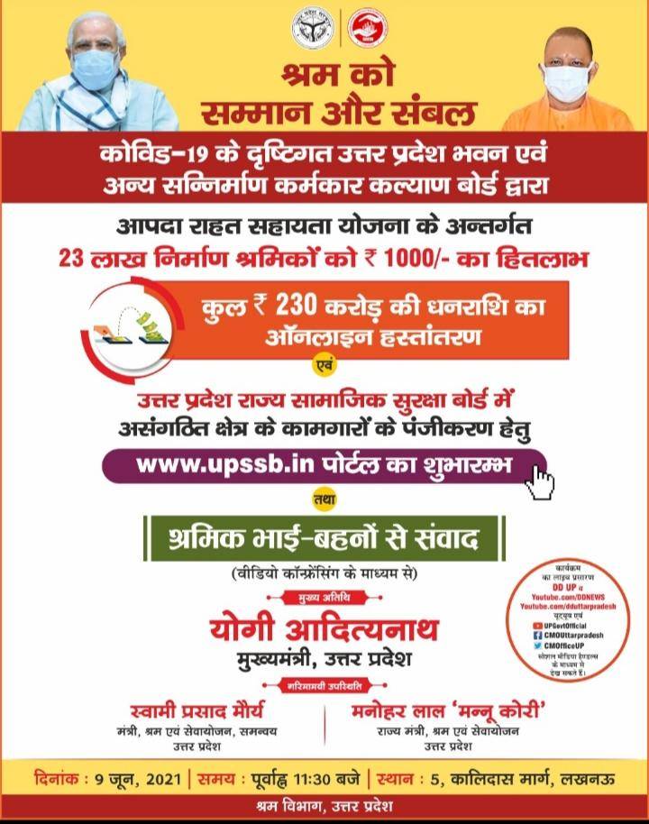 इस मौके पर उत्तर प्रदेश राज्य समाजिक सुरक्षा बोर्ड में असंगठित क्षेत्र के कामगारों के पंजीकरण के लिए www.upssb.in पोर्टल का शुभारंभ भी होगा. इस मौके पर मुख्यमंत्री योगी आदित्यनाथ वीडियो कॉन्फ्रेंसिंग के माध्यम से श्रमिकों से संवाद करेंगे.