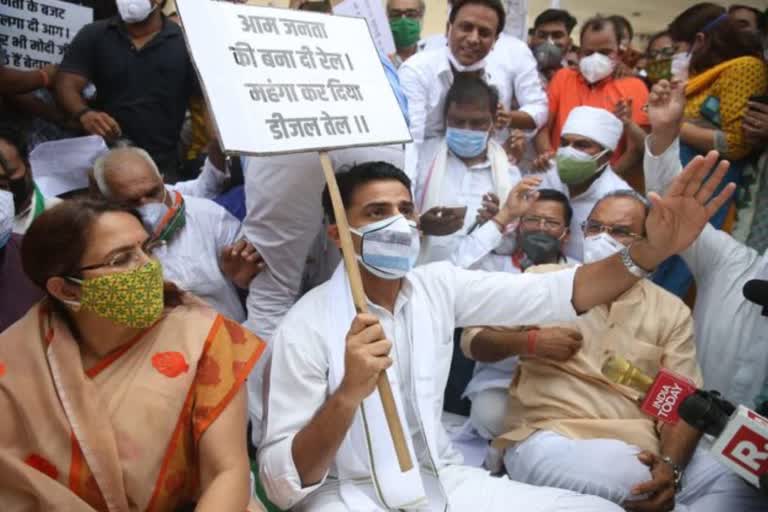 जयपुर: कांग्रेस (Congress) पार्टी ने शुक्रवार को पेट्रोल-डीजल की बढ़ती कीमतों के खिलाफ पूरे प्रदेश में प्रदर्शन किया. कांग्रेस नेताओं ने पेट्रोल पंपों पर प्रदर्शन किया. राजस्थान कांग्रेस ने भी प्रदर्शन किया लेकिन जयपुर में हुए प्रदर्शन में सबकी निगाहें सचिन पायलट (Sachin Pilot) पर टिकी रहीं. जो पार्टी से नाराज बताए जा रहे हैं. जितिन प्रसाद के बीजेपी में जाने के बाद सबकी निगाहें सचिन पायलट के हर एक्शन पर हैं. इस प्रदर्शन में सचिन पायलट के शामिल होने को लेकर भी कई सवाल थे. सचिन पायलट प्रदर्शन में तो शामिल हुए लेकिन आलाकमान को साफ-साफ संदेश अपने इशारों से दे दिया.