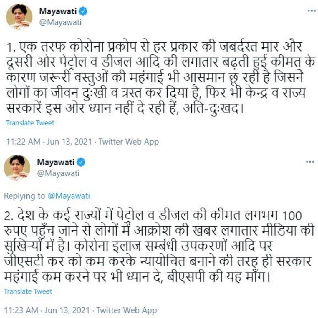 बसपा प्रमुख मायावती ने ट्वीट कर कहा, एक तरफ कोरोना वायरस के संक्रमण से हर प्रकार की जबरदस्त मार और दूसरी ओर पेट्रोल व डीजल आदि की लगातार बढ़ती हुई कीमत के कारण जरूरी वस्तुओं की महंगाई भी आसमान छू रही है जिसने लोगों का जीवन दुखी व त्रस्त कर दिया है, फिर भी केंद्र व राज्य सरकारें इस ओर ध्यान नहीं दे रही हैं. अति दुखद. देश के कई राज्यों में पेट्रोल व डीजल की कीमत लगभग ₹100 पहुंच जाने से लोगों में आक्रोश की खबर लगातार मीडिया की सुर्खियों में है. कोरोना इलाज संबंधी उपकरणों आदि पर जीएसटी कम करके न्यायोचित बनाने की तरह ही सरकार महंगाई कम करने पर भी ध्यान दे, बीएसपी की यह मांग है.