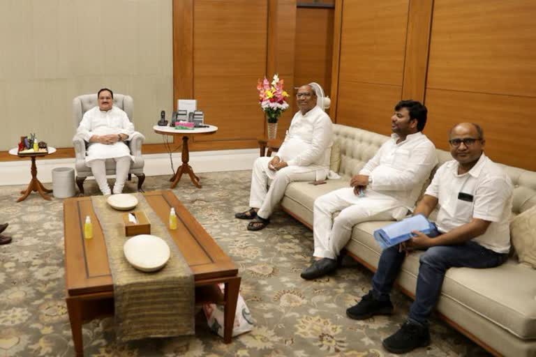 नई दिल्ली : भाजपा अध्यक्ष जेपी नड्डा ने मंगलवार को दिल्ली में उत्तर प्रदेश की निषाद पार्टी के प्रमुख नेताओं से मुलाकात कर आगामी विधानसभा चुनाव पर चर्चा की. नड्डा ने ट्वीट कर कहा, आज निषाद पार्टी के राष्ट्रीय अध्यक्ष संजय निषाद व लोकसभा सांसद प्रवीण निषाद से मुलाकात की.