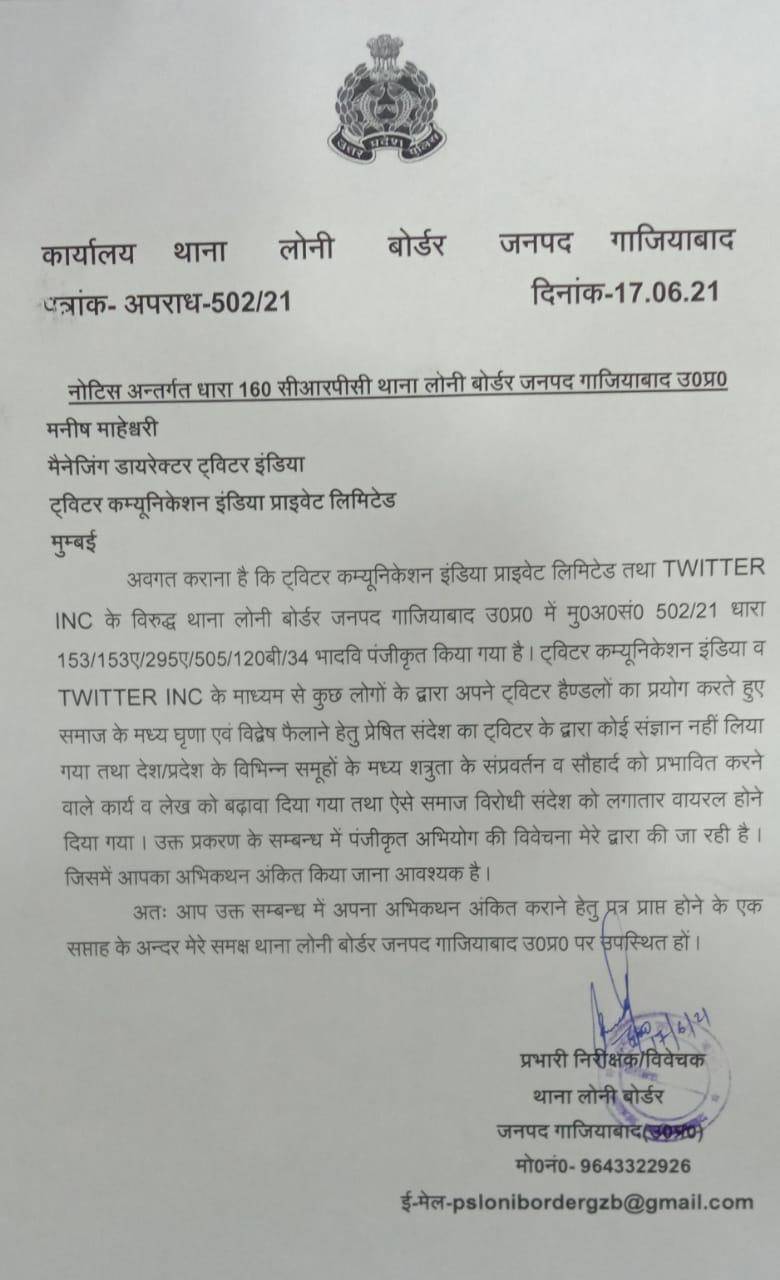 गाजियाबाद पुलिस द्वारा जारी नोटिस में लिखा गया है कि, ट्विटर कम्यूनिकेशन इंडिया प्राइवेट लिमिटेज व ट्विटर आईएनसी के विरुद्ध थाना लोनी बोर्डर जनपद गाजियाबाद में धारा 153, 153 ए, 295 ए, 505, 120 बी, 34 के तहत एफआईआर दर्ज की गई.
