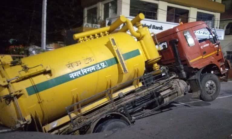 मुख्यमंत्री आवास के पास धंसी सड़क, फंसा नगर निगम का टैंकर