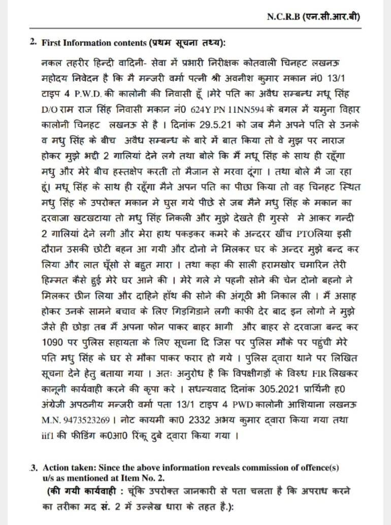 पीड़ित पीडब्ल्यूडी में सहायक अभियंता के पद पर तैनात है. उसने गोण्डा की रहने वाली एक्सईएन पति की एक कथित महिला मित्र और उसकी बहन के खिलाफ भी मुकदमा दर्ज करवाया है. पीड़ित मंजरी वर्मा का 2013 में बिजली विभाग में तैनात अधिशासी अभियंता अवनीश से विवाह हुआ था. महिला का आरोप है कि उसके एक्सईएन पति के कई लड़कियों से विवाहेत्तर संबंध हैं. पीड़ित अपने दो छोटे बच्चों के साथ पति से अलग रह रही है. एसीपी प्रवीण मलिक मामले की विवेचना कर रहे हैं. अवनीश कुमार, उसकी गर्लफ्रेंड मधु और मधु की बहन के खिलाफ एस/एसटी एक्ट के आलावा धारा 323, 504, 506, 342 और 392 के तहत चिनहट थाने में मुकदमा पंजीकृत करवाया है. विभागीय जानकारी के अनुसार, अवनीश कुमार को अधिशाषी अभियन्ता इंदिरा नगर से हटाते हुए मुख्यालय में अटैच कर दिया गया है.