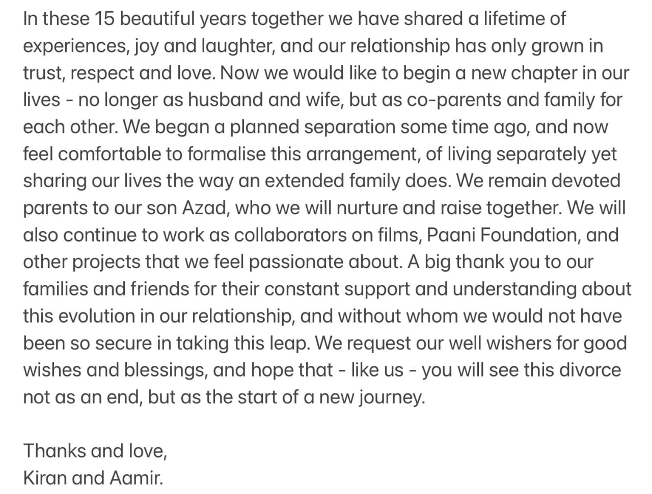 उन्होंने आगे लिखा, ‘हम दोनों अलग-अलग रहने के बावजूद अपने जीवन को एक विस्तारित परिवार की तरह शेयर करेंगे. हम अपने बेटे आजाद के प्रति समर्पित माता-पिता हैं, जिनका पालन-पोषण हम मिलकर करेंगे. हम फिल्मों, पानी फाउंडेशन और अन्य परियोजनाओं पर भी सहयोगी के रूप में काम करना जारी रखेंगे, जिनके बारे में हम दिल से परवाह करते हैं.