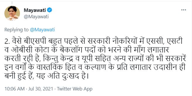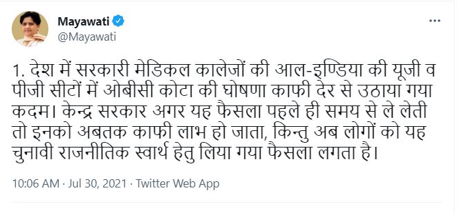 बीएसपी सुप्रीमो मायावती ने ट्वीट कर कहा कि, देश में सरकारी मेडिकल कॉलेजों की आल इंडिया की यूजी और पीजी सीटों में ओबीसी कोटा की घोषणा काफी देर से उठाया गया कदम. केंद्र सरकार अगर यह फैसला पहले ही समय से ले लेती तो इनको अबतक काफी लाभ हो जाता, किन्तु अब लोगों को यह चुनावी राजनीतिक स्वार्थ के लिए लिया गया फैसला लगता है. वैसे बीएसपी बहुत पहले से सरकारी नौकरियों में एससी, एसटी और ओबीसी कोटा के बैकलॉग पदों को भरने की मांग लगातार करती रही है, किन्तु केंद्र और यूपी सहित अन्य राज्यों की भी सरकारें इन वर्गों के वास्तविक हित और कल्याण के प्रति लगातार उदासीन ही बनी हुई हैं, यह अति दुःखद है.