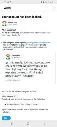 राहुल गांधी और कांग्रेस के कई अन्य नेताओं के बाद अब ट्विटर ने कांग्रेस के आधिकारिक ट्विटर अकाउंट को लॉक कर दिया है। कांग्रेस ने गुरुवार को आरोप लगाया कि ट्विटर ने कांग्रेस के आधिकारिक हैंडल @INCIndia को लॉक कर दिया है। इसकी जानकारी पार्टी ने अपने फेसबुक पेज के जरिए दी है। माना जा रहा है कि ट्विटर ने नियमों के उल्लंघन को लेकर यह कार्रवाई की है। इससे पहले इसी तरह की कार्रवाई सोशल मीडिया कंपनी राहुल गांधी समेत कई कांग्रेस नेताओं के खिलाफ कर चुकी है।