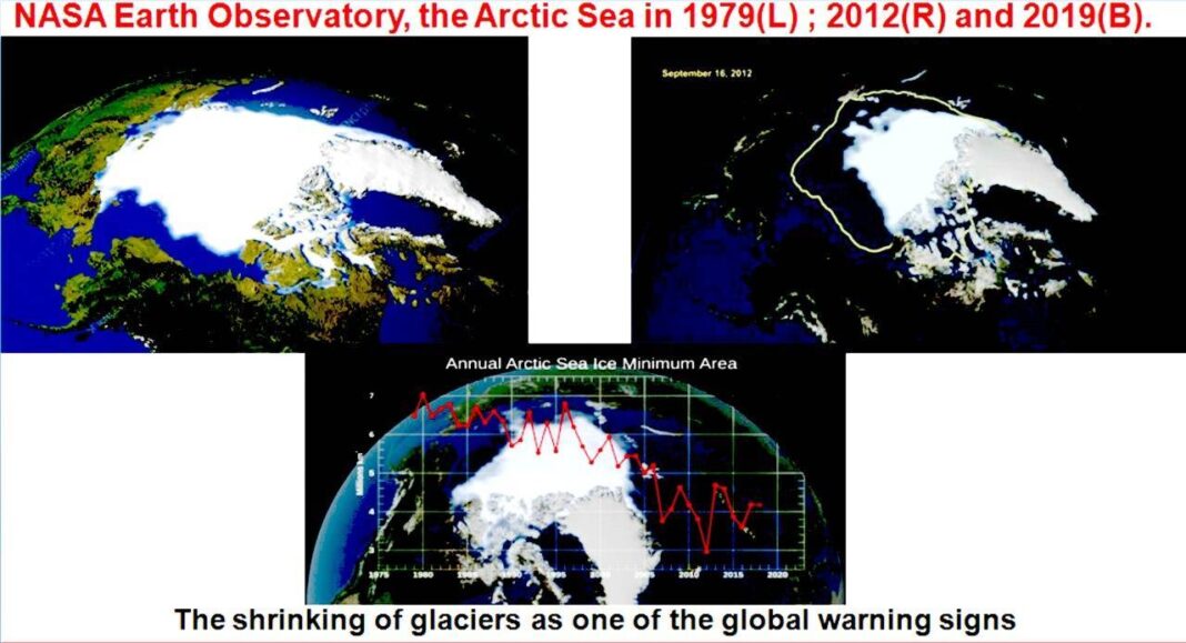 नासा के उपग्रह से 2019 में लिए गए चित्रों को देखकर स्वतः आप समझ सकते है कि 1980 में 70,00,000 वर्ग किलोमीटर से घटकर 1990 में 58,00,000 वर्ग किलोमीटर, 2000 में 52,50,000 वर्ग किलोमीटर, 2012 में 30,00,000 वर्ग किलोमीटर और 2019 में 35,50,000 वर्ग किलोमीटर न्यूनतम बची थी, जो 2020 में बढकर 41,50,000 वर्ग किलोमीटर आ गयी | यह कोरोना में हुए लाकडाउन के कारण जलवायु परिवर्तन में सुधार और 2020 में 1980 के सापेक्ष 40.7% और 2012 में 1980 के सापेक्ष 57.1% ग्लेशियर समाप्त होना दर्शाता है |